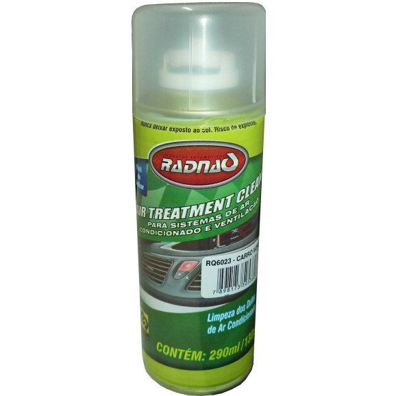O AIR TREATMENT CLEAN RADNAQ é um produto em aerossol que foi desenvolvido para a limpeza no sistema de ar condicionado. O produto foi desenvolvido para ser utilizado no interior de automóveis, ônibus, caminhões ou qualquer outro ambiente que necessite de limpeza. Após a aplicação secar as partes umedecidas como carpete, partes internas (painel), bancos e etc. Para uma perfeita limpeza e total garantia do produto, antes da aplicação é necessário a substituição do filtro.