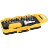 1 Jogo de bits/ponteiras com encaixe sextavado de 1/4", composto por um estojo plástico com 38 peças, sendo: 1 cabo adaptador encaixe 1/4" com catraca reversível, 1 adaptador encaixe quadrado 1/4" e sextavado 1/4", 8 ponteiras fenda (4 mm, 5 mm, 5,5 mm e 6 mm (2 unidades cada)), 10 ponteiras phillips (n° 0 (3 unidades), n° 1 (4 unidades) e n° 2 (3 unidades)), 10 ponteiras torx (T10, T15, T20, T25 e T30 (2 unidades cada)) e 8 ponteiras allen (4 mm (3 unidades), 5 mm (3 unidades) e 6 mm (2 unidades))