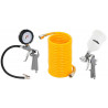 1 Jogo com 4 peças, sendo: 1 pistola para pintura tipo gravidade, 1 pistola para calibrar pneu, 1 mangueira espiral PU + PVC com diâmetro interno de 1/4" com 5 m de comprimento e conexões e 1 bico para limpeza
