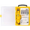 1 Microrretífica, composta por um estojo plástico com 174 acessórios, sendo: 12 lixas cilindro, 1 roda de pano, 3 rodas de feltro, 1 ponta de feltro, 1 roda de borracha, 2 brocas de aço rápido de 1,6 mm, 1 broca de aço rápido de 2,4 mm, 1 broca de aço rápido de 3,2 mm, 2 hastes para lixa cilindro, 5 limas rotativas diamantadas, 2 limas rotativas, 3 pontas montadas de óxido de alumínio, 3 rebolos de óxido de alumínio, 2 pontas montadas de carbureto de silício, 3 rebolos de carbureto de silício, 3 escovas de inox, 1 pasta para polimento, 74 discos de corte, 44 discos de lixa, 2 pinças de 3,2 mm, 1 pinça de 2,4 mm, 1 pinça de 1,6 mm, 1 haste para disco de corte, 1 haste para disco de borracha, 1 haste para disco de feltro, 1 haste para disco de lixa, 1 chave de 9,5 mm para microrretífica e 1 bastão abrasivo