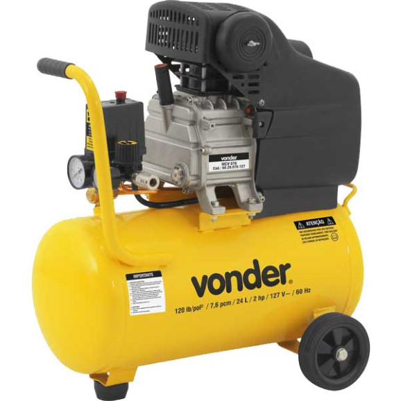 Compacto e portátil, com potência de 2 hp e reservatório com 24 litros de capacidade. Possui manômetro, regulador de pressão, chave liga/desliga, além de rodas e alça que facilitam o manuseio e o transporte.